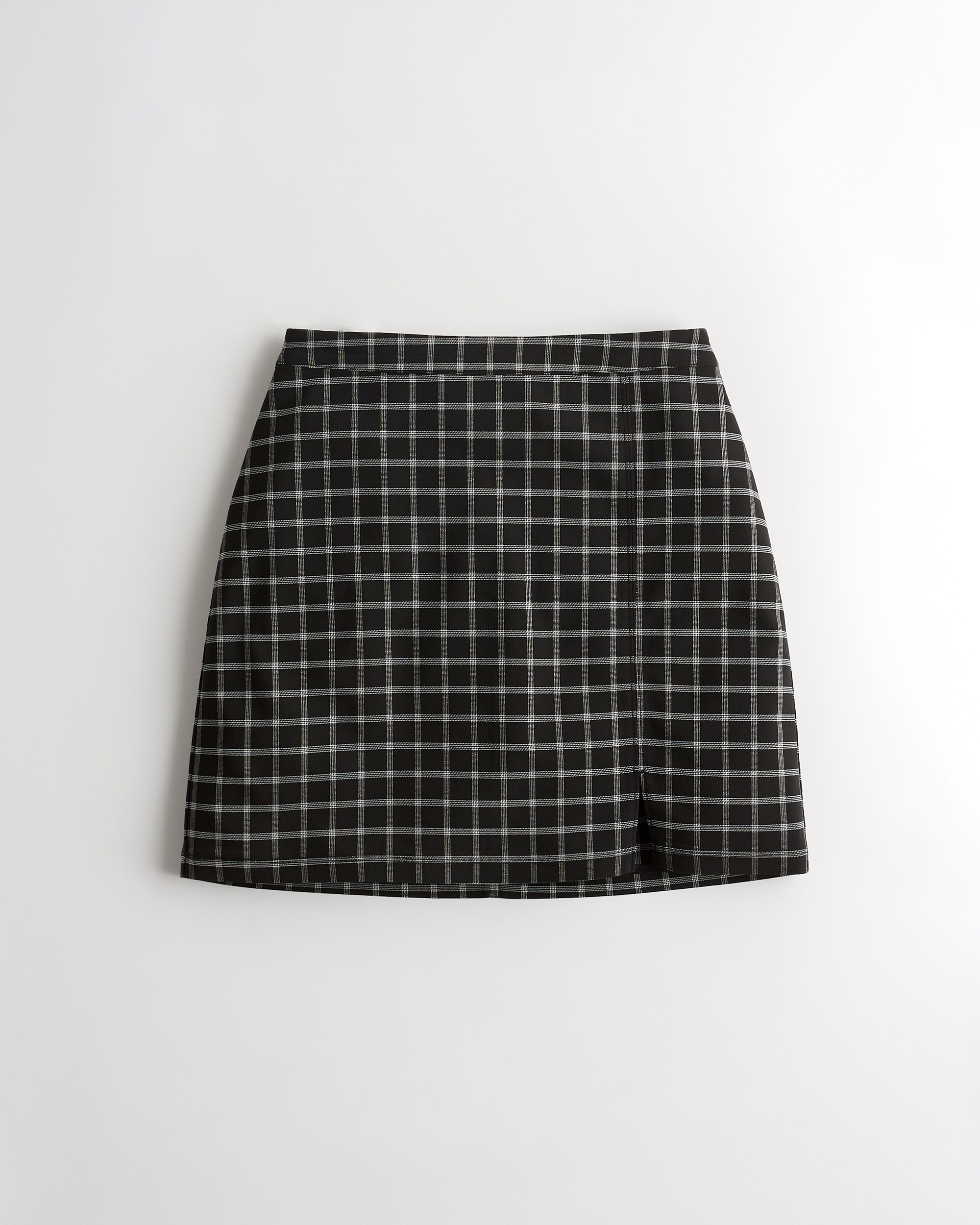 A fitted plaid mini dress with throwback 90s vibes featuring advanced stretch woven fabric a flattering square neckline wide shoulder straps and subtle front slit.